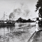 Datation resserrée : 1905–1913 (médiane 1909). Le lieu paraît être une rive de la Seine ou de la Marne en banlieue industrielle parisienne, appréciation probable à 70 %. Instantané familial d’une promenade ou fête nautique, la dame appartenant vraisemblablement à une bourgeoisie urbaine. Pour l’identifier, consulter les registres des sociétés nautiques locales, la presse municipale annonçant les régates 1905–1913 et confronter avec les albums familiaux ou cartes postales privées du même secteur.