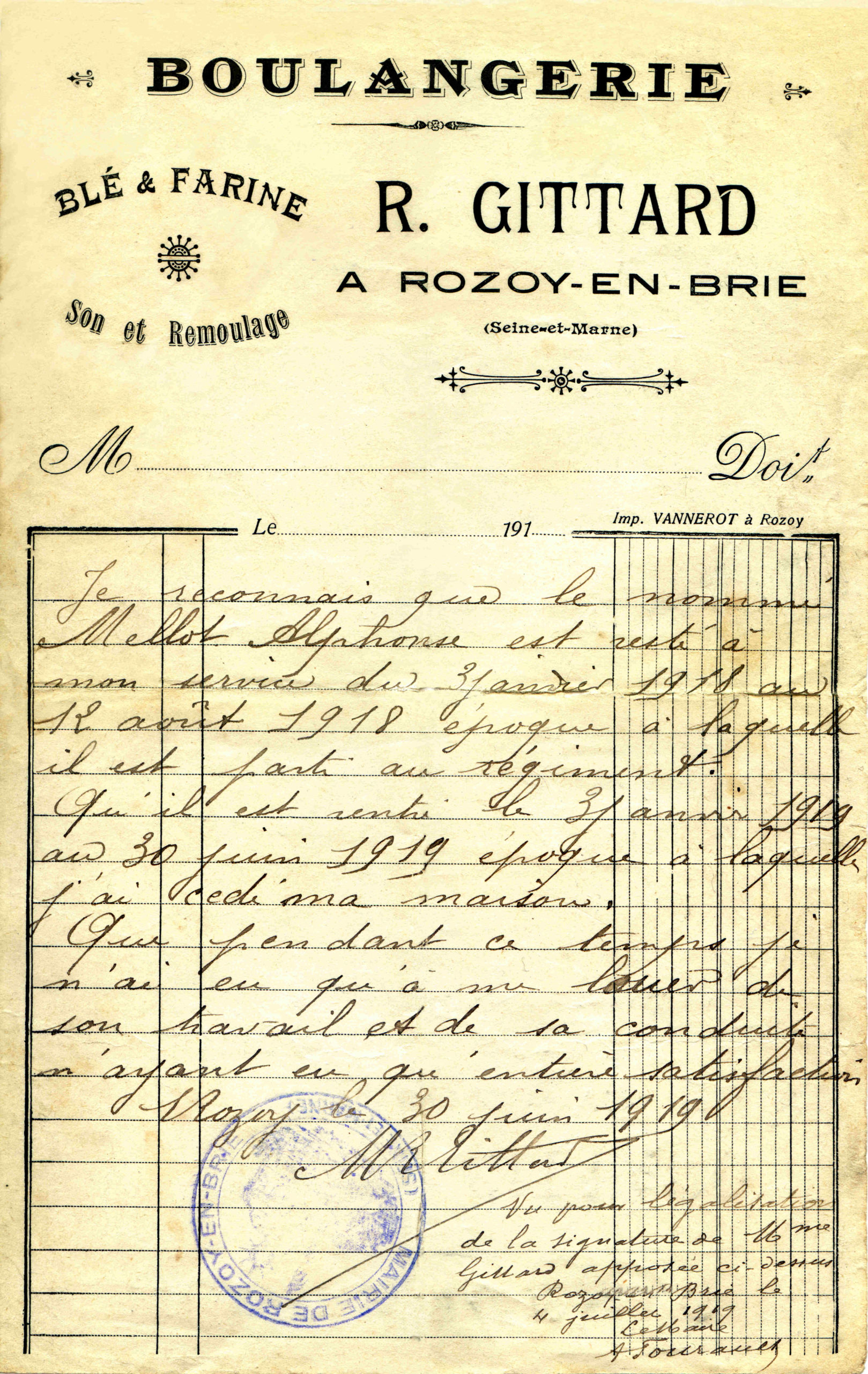 Certificat de travail remis à Alphonse MELLOT suite à son engagement volontaire pour la durée de la guerre en 1918 et qui à donc interrompu son emploi de apprenti boulanger.