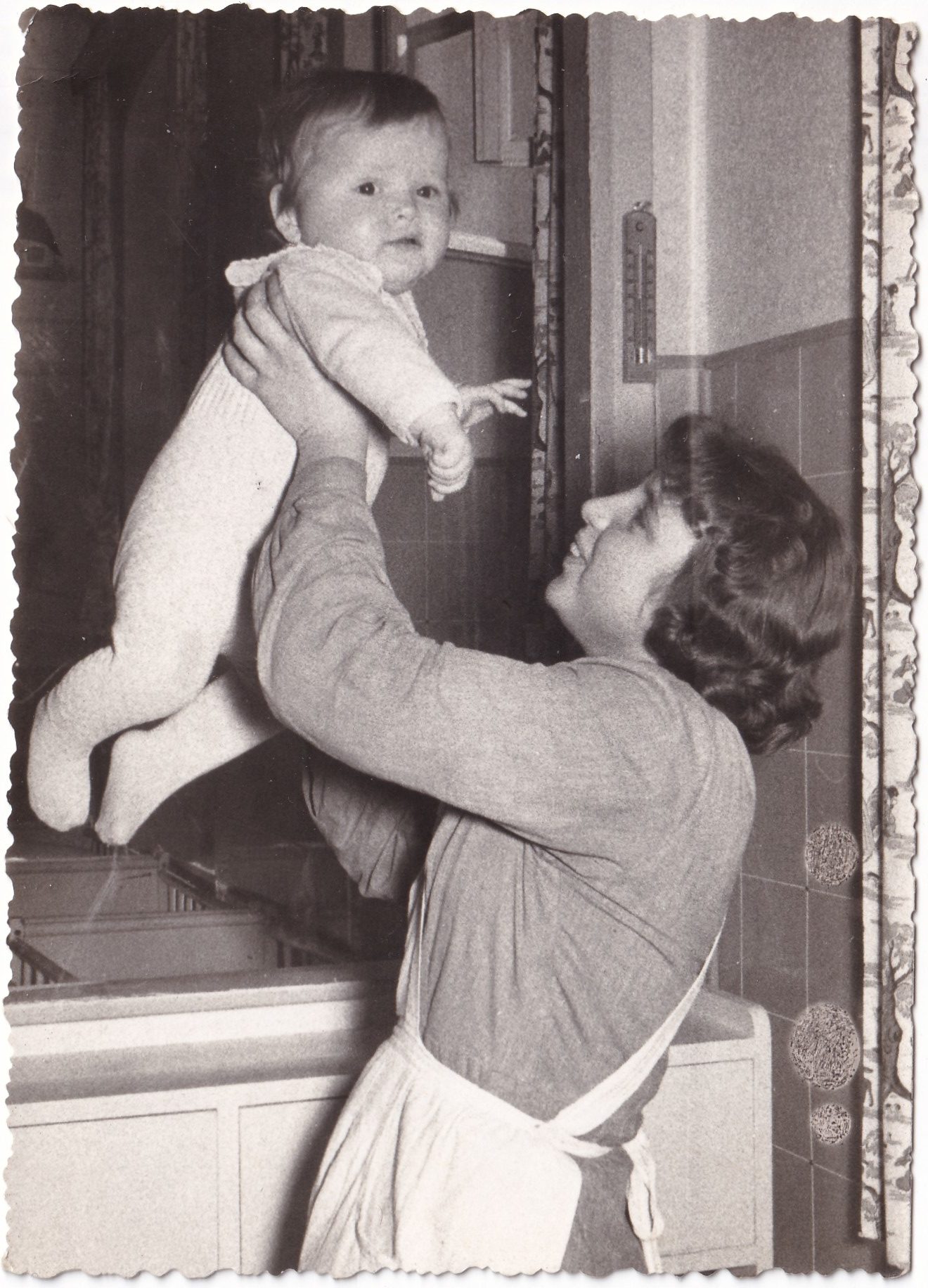 Femme soulevant un bébé. Photographie trouvée dans une vente aux enchères.