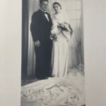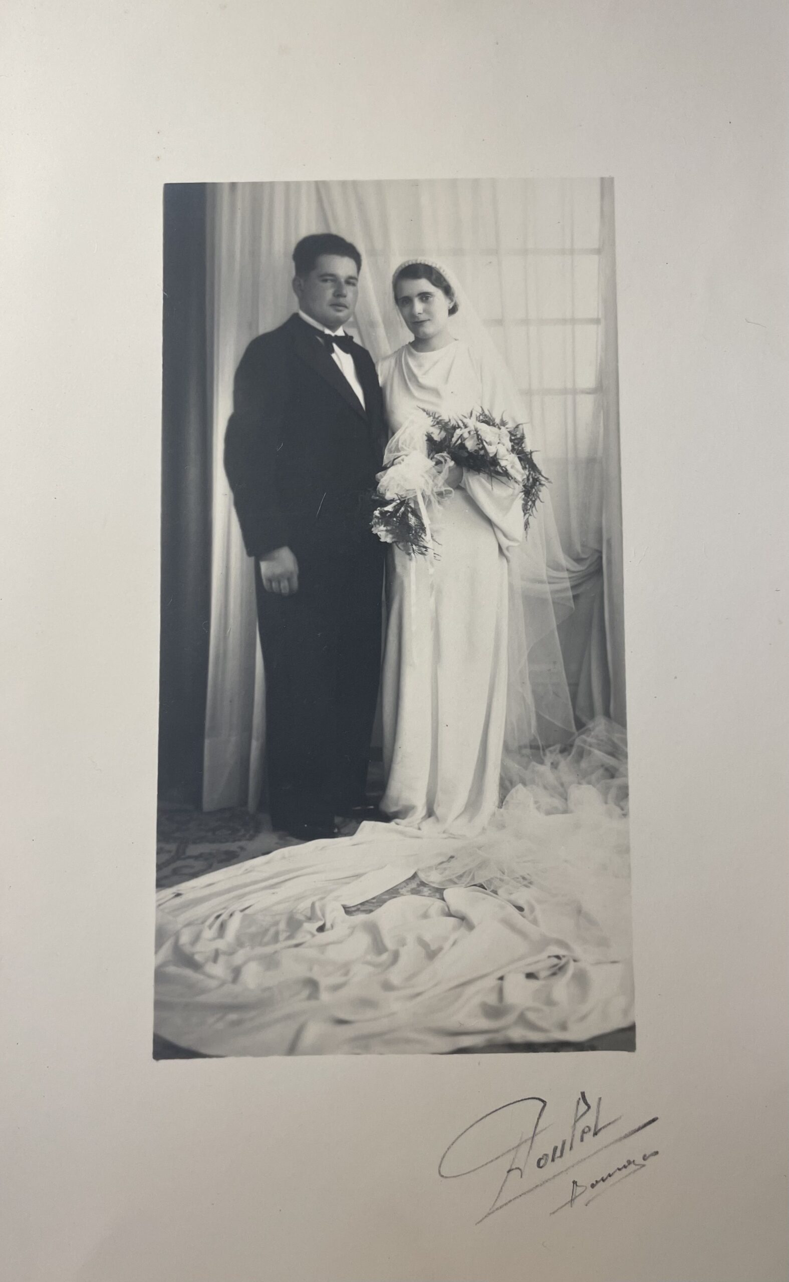 Les indices vestimentaires et la présentation situent la prise de vue entre 1934 et 1937, médiane 1935. Le carton signé « Philp » laisse penser à un studio français, certitude moyenne. Il s’agit d’un portrait de mariage formel exécuté en intérieur par un photographe professionnel. Pour affiner, consulter les annuaires de photographes commerciaux des années 1930 et les registres du dépôt légal des tirages signés « Philp » dans les archives départementales.
