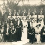 La convergence des tenues, des coiffures et du mobilier situe l’image entre 1936 et 1940, avec une année médiane autour de 1938. Elle a probablement été réalisée par un photographe professionnel travaillant in situ dans le jardin d’un hôtel ou d’une demeure bourgeoise en France. Le cliché représente un groupe de mariage, soigneusement ordonné, capté en lumière naturelle avant la mobilisation de 1939. Pour affiner la datation et l’attribution, on pourra confronter les actes d’état civil 1936-1940 et les annuaires professionnels des photographes locaux, ainsi que les dossiers de la Marine pour identifier l’officier décoré.
