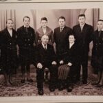 Cette composition familiale en studio se situe vraisemblablement entre 1948 et 1953 (médiane 1950) dans un atelier provincial, lieu probable : Bretagne, certitude moyenne. L’ensemble évoque un portrait commémoratif réunissant parents et six grands adolescents encore en uniforme scolaire. Pour affiner, consulter les annuaires professionnels bretons 1947-1955 et comparer l’écusson des manteaux aux registres d’établissements catholiques locaux.