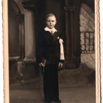 L’épreuve se situe vraisemblablement entre 1940 et 1947, médiane 1944. L’atelier, non identifié, est probablement celui d’une ville d’Europe de l’Ouest catholique (France ou Belgique, degré de certitude moyen). La scène est un portrait de première communion réalisé sur papier gélatino-argentique à bord dentelé, décor gothique soulignant le caractère religieux. Pour confirmer, inspecter le verso pour un éventuel tampon et consulter les registres paroissiaux de communions 1942-1946 ainsi que les annuaires locaux de photographes actifs à cette période.