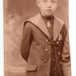 Le cliché se date très vraisemblablement de 1905-1914 (médiane 1910), période où les portraits de première communion en costume marin étaient courants. Faute de marque au recto, le studio reste indéterminé mais paraît français et urbain, hypothèse probable. La photographie immortalise un garçon d’environ onze ans lors de sa première communion, identifiable par le monogramme marial et la pochette blanche. Pour préciser lieu et photographe, consulter les registres paroissiaux de communion 1908-1912 et les annuaires locaux de photographes tenus par les Chambres de commerce.