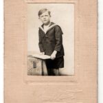 La combinaison du montage embossé, du costume marin et de la marque « Jean Bézat – 32 r. d’Aboukir » situe très probablement la prise de vue entre 1913 et 1918 (médiane 1915) à Paris, studio Jean Bézat (certitude : probable). Il s’agit d’un portrait d’enfant destiné à l’album familial ou aux envois cartonnés, sans signe religieux couvrant la première communion. Pour affiner, consulter le Bottin-Didot 1910-1920 pour la date d’installation du photographe et les archives commerciales du 2ᵉ arrondissement. Une recherche dans l’état-civil parisien des familles clientes de ce studio autour de 1915 pourrait rapprocher l’identité du garçon.