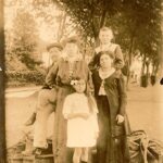 La convergence des vêtements, des coiffures et du support situe vraisemblablement la vue entre 1908 et 1914 (médiane 1911). Prise de vue en extérieur, probablement à Paris sur un boulevard arboré, certitude moyenne en l’absence de marque. Il s’agit d’un portrait familial informel réalisé lors d’une promenade, sans doute avec un appareil Kodak amateur. Pour affiner, consulter les annuaires municipaux d’amateurs photographes ou les archives d’urbanisme illustrant les boulevards plantés vers 1910, ainsi que les catalogues de prêt-à-porter féminins parisiens de la même période.