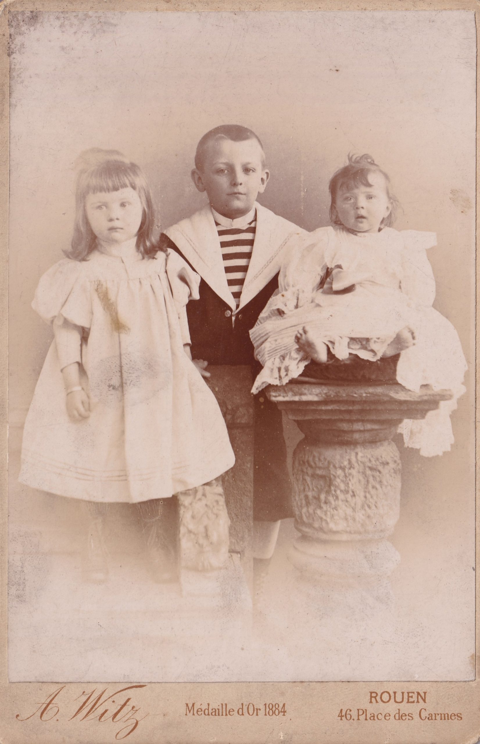 Portrait de André BUCHY (8 et demi) avec ses cousines Suzanne (3 ans et demi) et Marthe AVENELLE (un an et demi), conservée dans un album de famille trouvée dans une vente aux enchères.