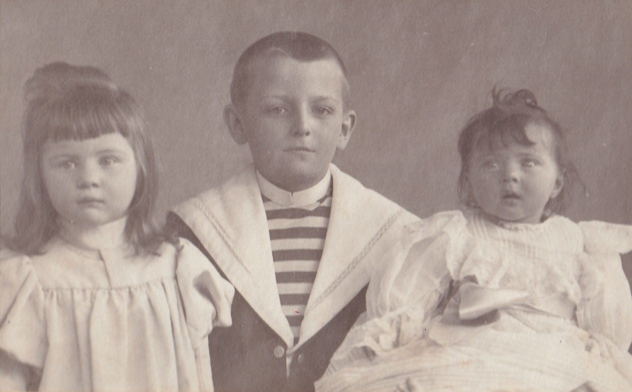 Portrait de André BUCHY (8 et demi) avec ses cousines Suzanne (3 ans et demi) et Marthe AVENELLE (un an et demi), conservée dans un album de famille trouvée dans une vente aux enchères.