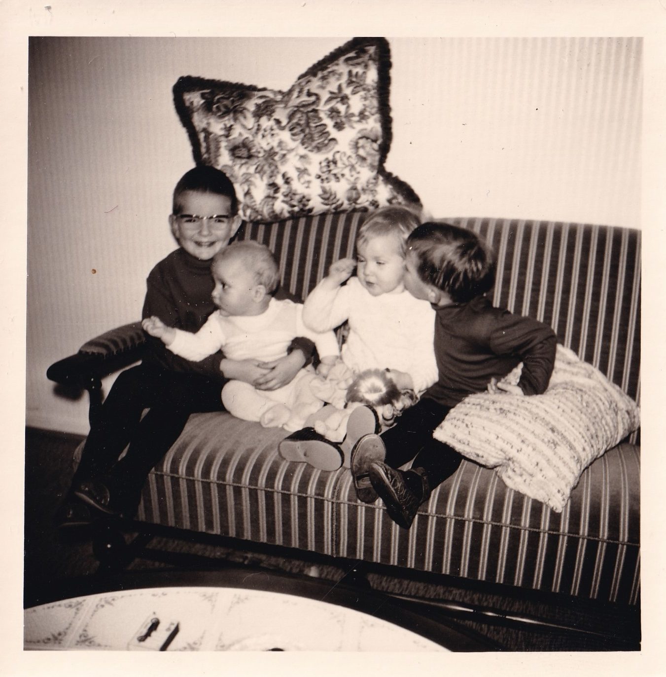 Quatre enfants sur un canapé à rayures. Photographie trouvée dans une vente aux enchères.