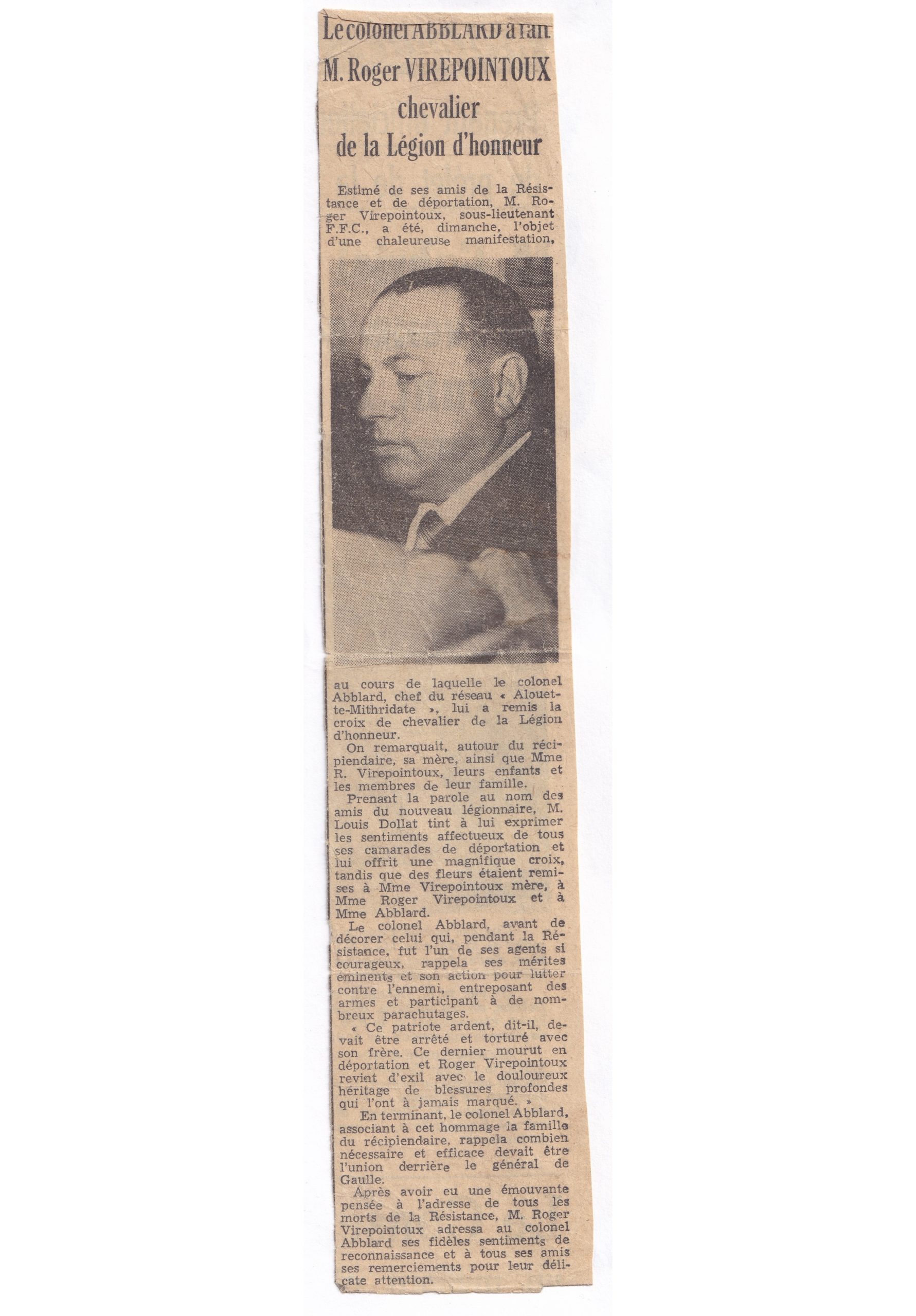 Roger Virepointoux, frère de mon arrière-grand-père Georges, Résistant et agent P2 du réseau “Alouette – Mithdrate” reçoit du Colonel Abblard, chef dudit réseau, la croix de Chevalier de la Légion d’Honneur.