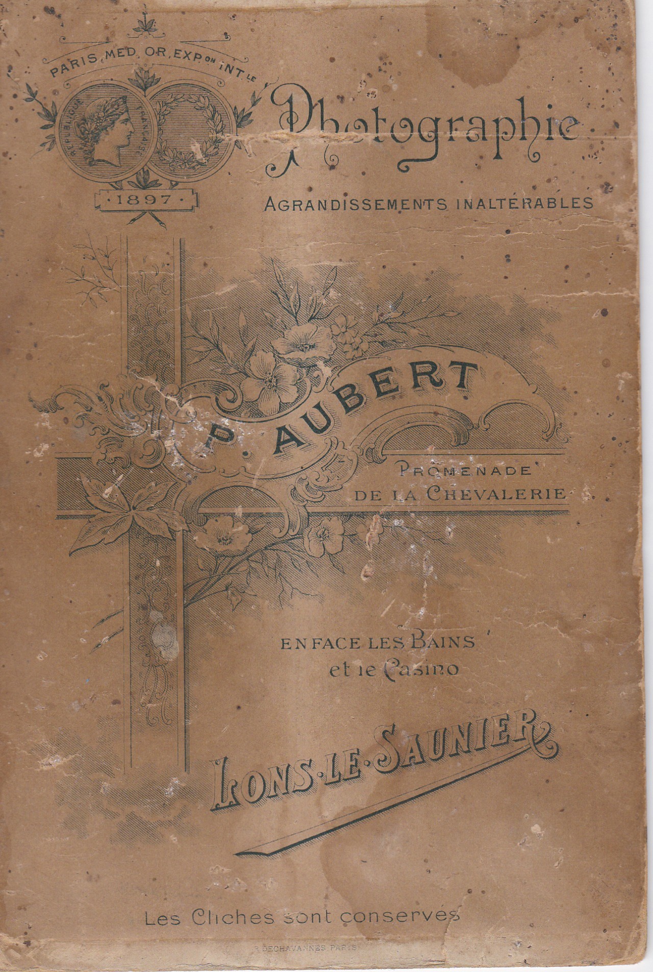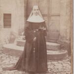 La combinaison du carton « cabinet », du graphisme Art-Nouveau et de l’absence de dos divisé situe la prise aux environs de 1896-1902 (médiane : 1899). Le studio P. Aubert, imprimé, rend le lieu de Lons-le-Saunier probable. Il s’agit très vraisemblablement d’un portrait de première profession ou de prise d’habit d’une jeune religieuse, destiné à la famille. Pour affiner : consulter les registres conventuels locaux et l’Annuaire des photographes français afin de dater l’activité de P. Aubert.