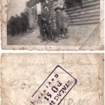 Datation resserrée : 1940 – 1944, médiane 1942. Lieu probable : camp de prisonniers Stalag II D, secteur PÜ 51 (niveau de certitude : probable). Le cliché, vraisemblablement réalisé par un prisonnier, servait de message familial et montre trois détenus ou ouvriers en tenue de travail devant un baraquement. Pour approfondir : consulter les archives du Comité international de la Croix-Rouge pour les fiches individuelles et le Bundesarchiv ou la BA-MA pour les registres du Stalag II D et de ses kommandos.