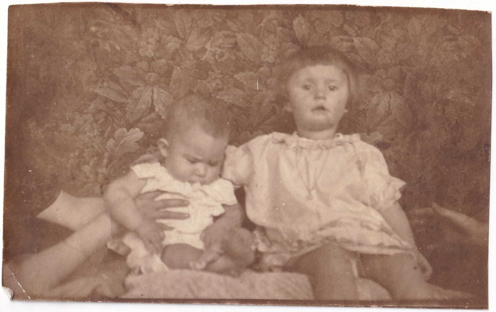 Photographie d’une petite fille avec un bébé. Photographie trouvée dans une vente aux enchères. Origine France ou Allemagne.